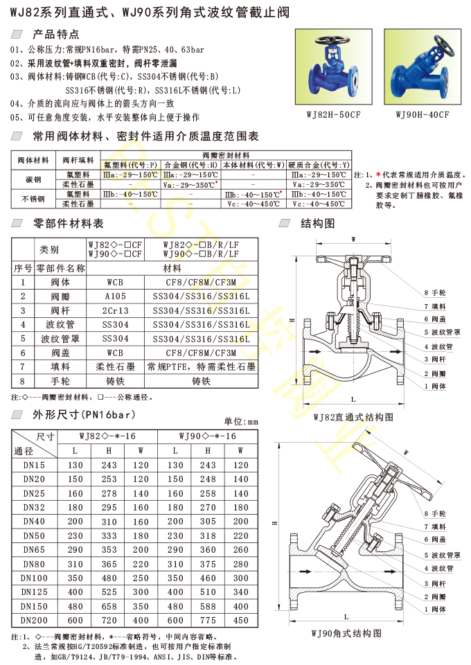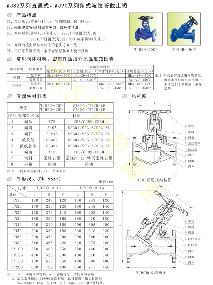 WJ82系列直通式、WJ90系列角式波纹管截止阀