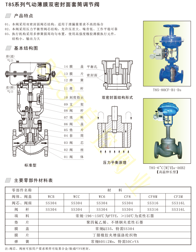 01、本阀采用双密封面阀芯结构,适用于泄漏量要求不高的场合