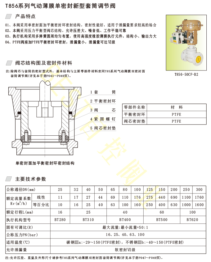 01、本阀采用单密封面加平衡密封环密封结构,密封性能好,适用于泄漏量要求较高的场合