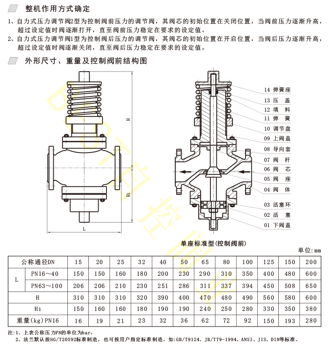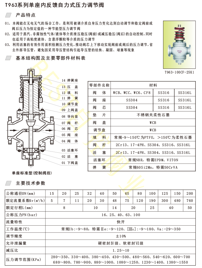 01、本阀能在无电无气的场合工作,是利用被调介质自身压力变化达到自动调节和稳定阀前或阀后压力为恒定