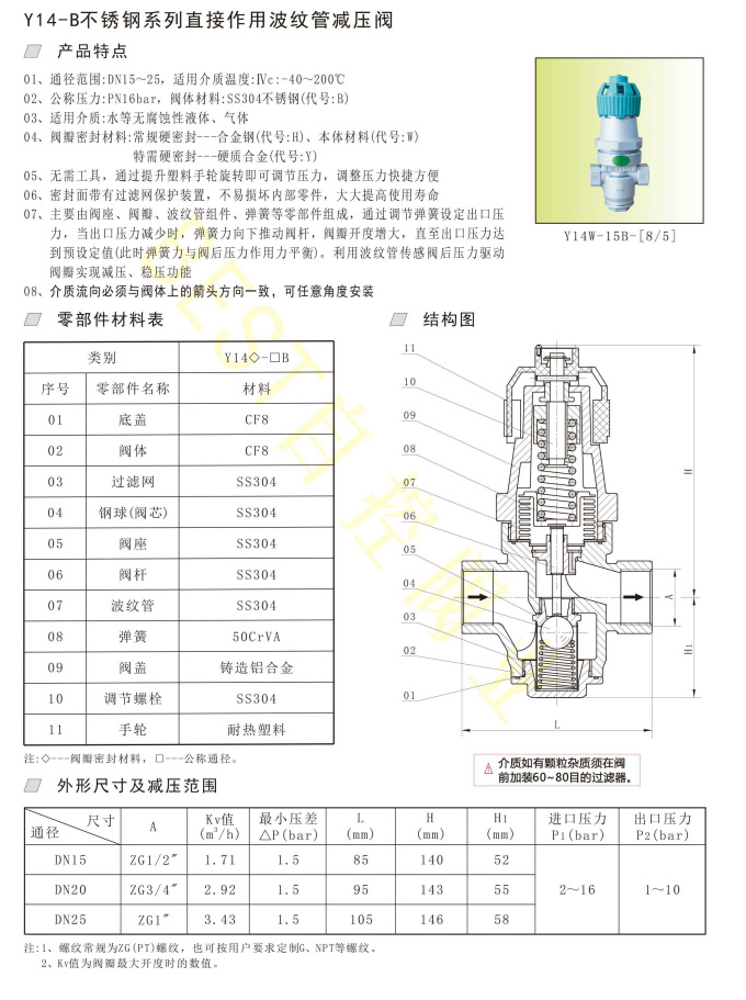 01、通径范围:DN15~25,适用介质温度:Ⅳc:-40~200℃