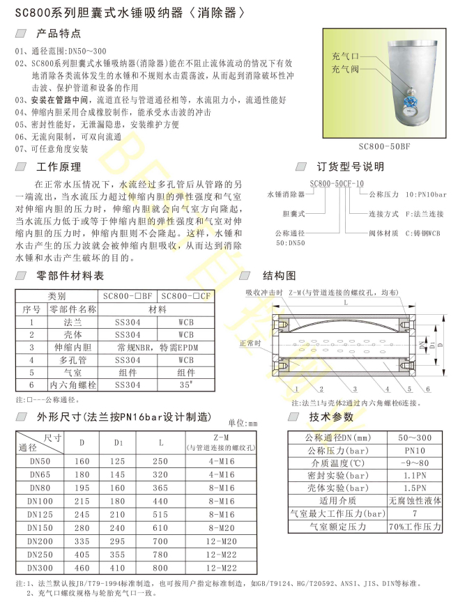 02、SC800系列胆囊式水锤吸纳器(消除器)能在不阻止流体流动的情况下有效 地消除各类流体发生的水锤和不规则水击震荡波,