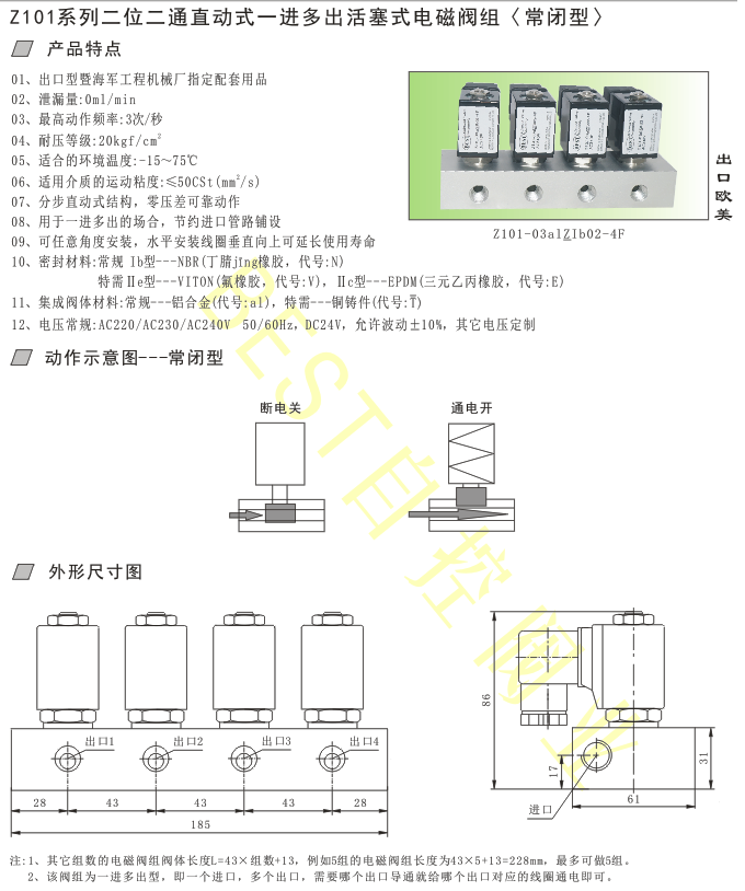 Z101系列二位二通直动式一进多出活塞式电磁阀组〈常闭型〉