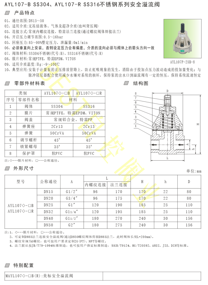 AYL107-B SS304、AYL107-R SS316不锈钢系列安全溢流阀