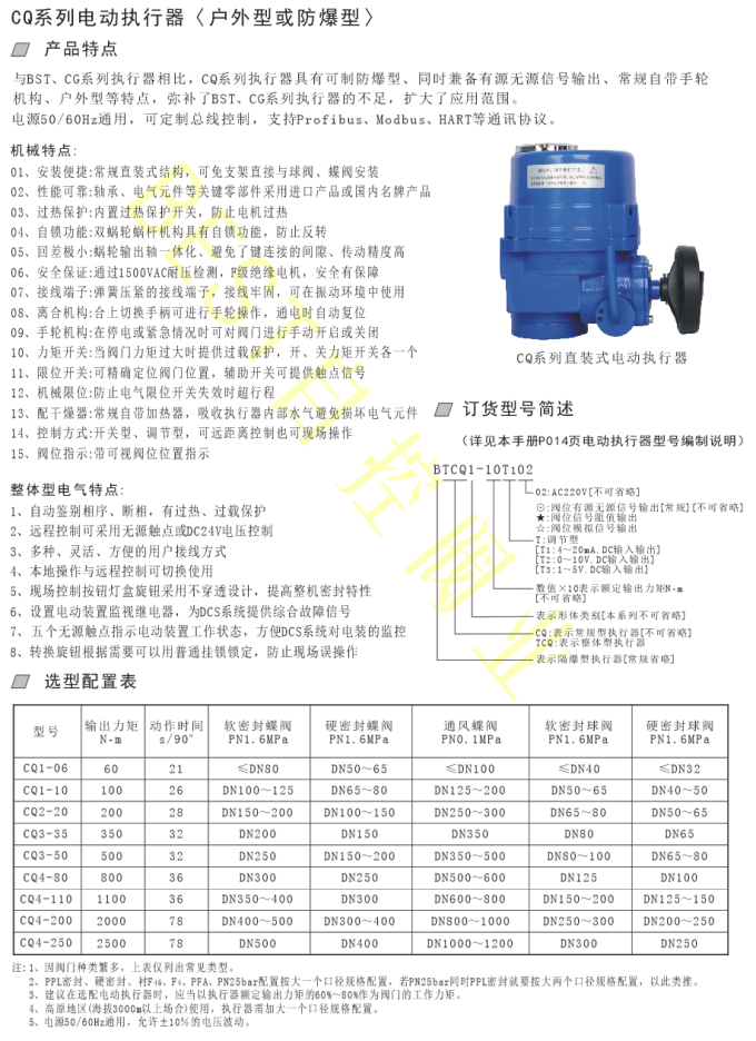 与BST、CG系列执行器相比,CQ系列执行器具有可制防爆型、同时兼备有源无源信号输出、常规自带手轮