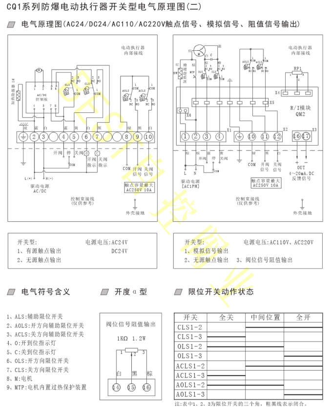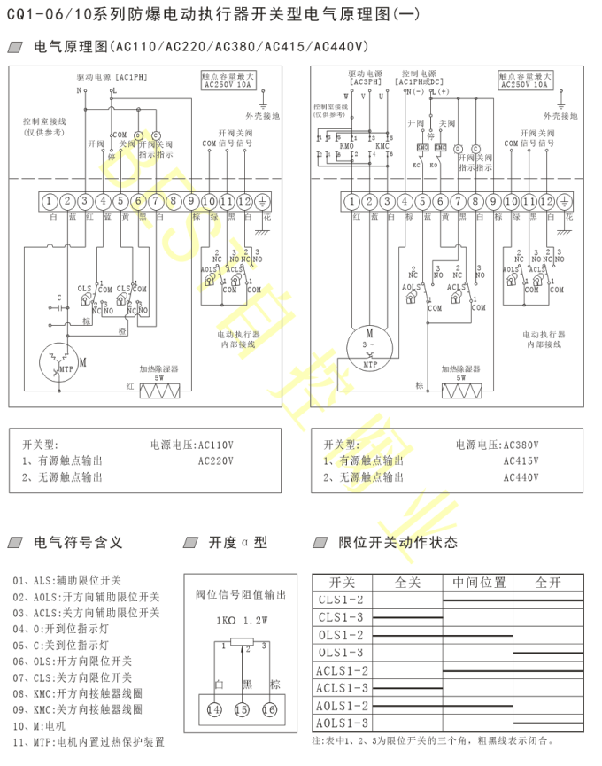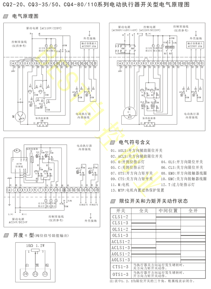 10、力矩开关:当阀门力矩过大时提供过载保护,开、关力矩开关各一个