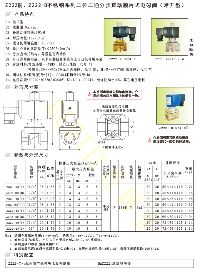 Z222铜、Z222-B不锈钢系列二位二通分步直动膜片式电磁阀〈常开型〉