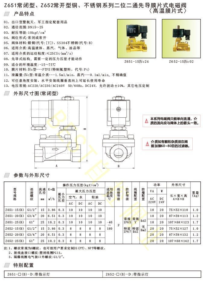 Z651常闭型、Z652常开型铜、不锈钢系列二位二通先导膜片式电磁阀〈高温膜片式〉