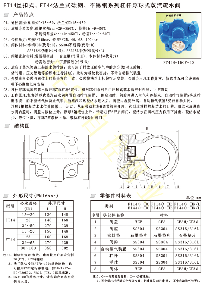 FT14丝扣式、FT44法兰式碳钢、不锈钢系列杠杆浮球式蒸汽疏水阀