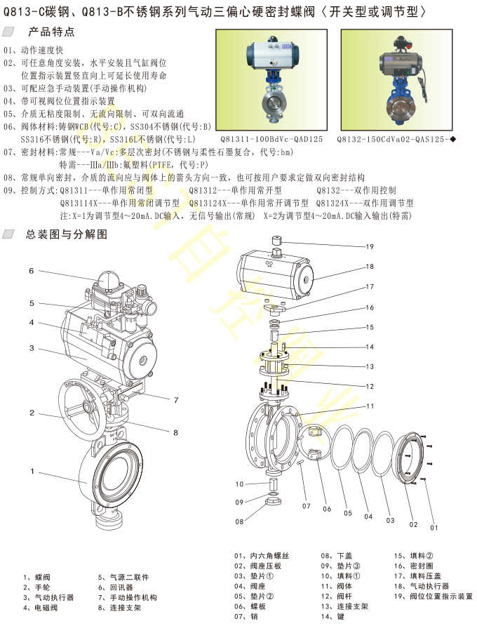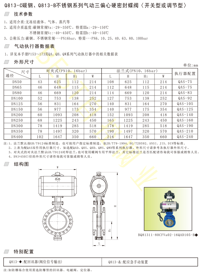 Q813-C碳钢、Q813-B不锈钢系列气动三偏心硬密封蝶阀〈开关型或调节型〉