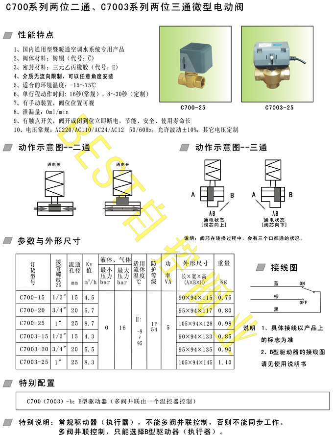 C700系列开关式电动阀用于控制冷水或热水空调系统管道的开启或关闭,达到控制室温之目的。驱动器由单向磁滞同步电机驱动,阀门弹簧复位。阀门不工作时处于常闭状态,当需要工作时,由温控器提供一个开启信号,使电动阀接通交流电源而动作,开启阀门,冷冻水或热水进入风机盘管,为房间提供冷气或暖气;当室温达到温控器设定值时,温控器令电动阀断电,复位弹簧使阀门关闭,从而截断进入风机盘管的水流。通过阀门关