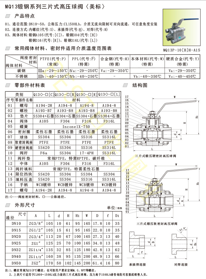 01、通径范围:DN10~50,公称压力:CL1500Lb,介质无流向限制可双向流通,可任意角度安装