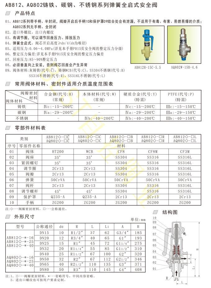 AB812、AQ802铸铁、碳钢、不锈钢系列弹簧全启式安全阀