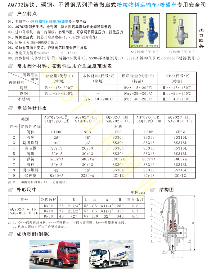 AQ702铸铁、碳钢、不锈钢系列弹簧微启式粉粒物料运输车/粉罐车专用安全阀