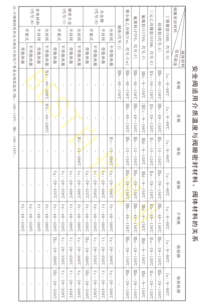 安全阀适用介质温度与阀瓣密封材料、阀体材料的关系