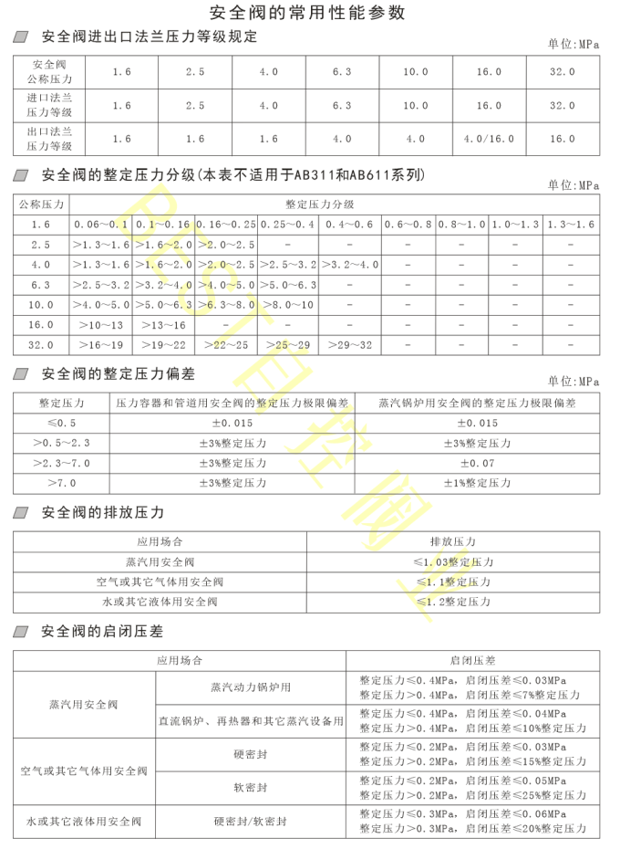 安全阀的整定压力分级(本表不适用于AB311和AB611系列)