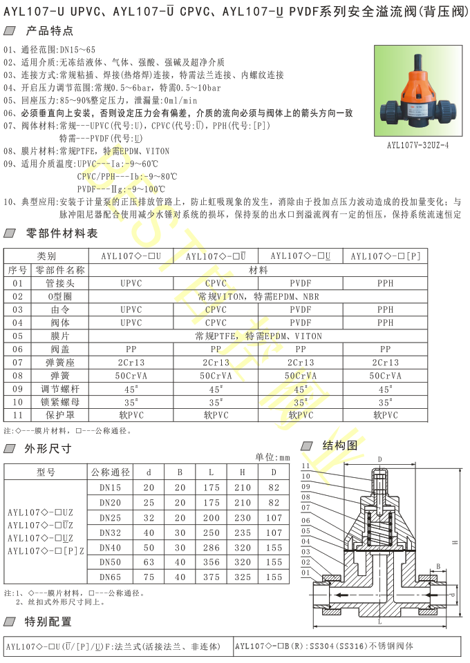 AYL107-U UPVC、AYL107-U CPVC、AYL107-U PVDF系列安全溢流阀(背压阀)