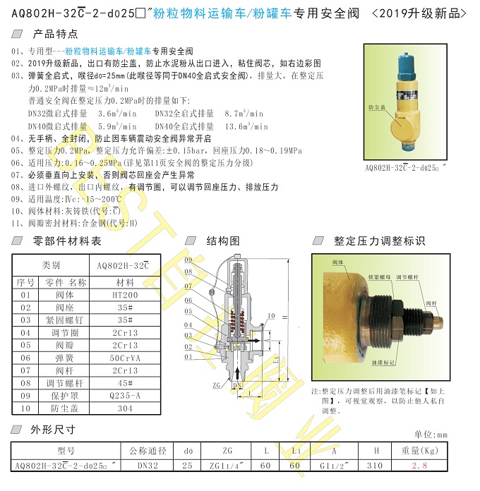 AQ802H-32C-2-d025□"粉粒物料运输车/粉罐车专用安全阀  <2019升级新品>