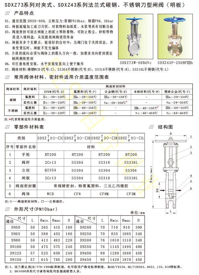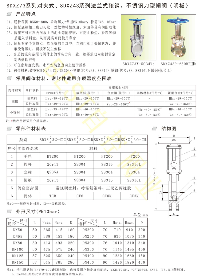 SDXZ73系列对夹式、SDXZ43系列法兰式碳钢、不锈钢刀型闸阀〈明板〉