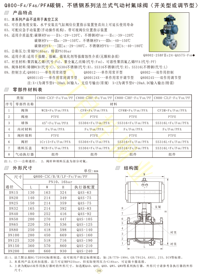 Q800-F4/F46/PFA碳钢、不锈钢系列法兰式气动衬氟球阀〈开关型或调节型〉