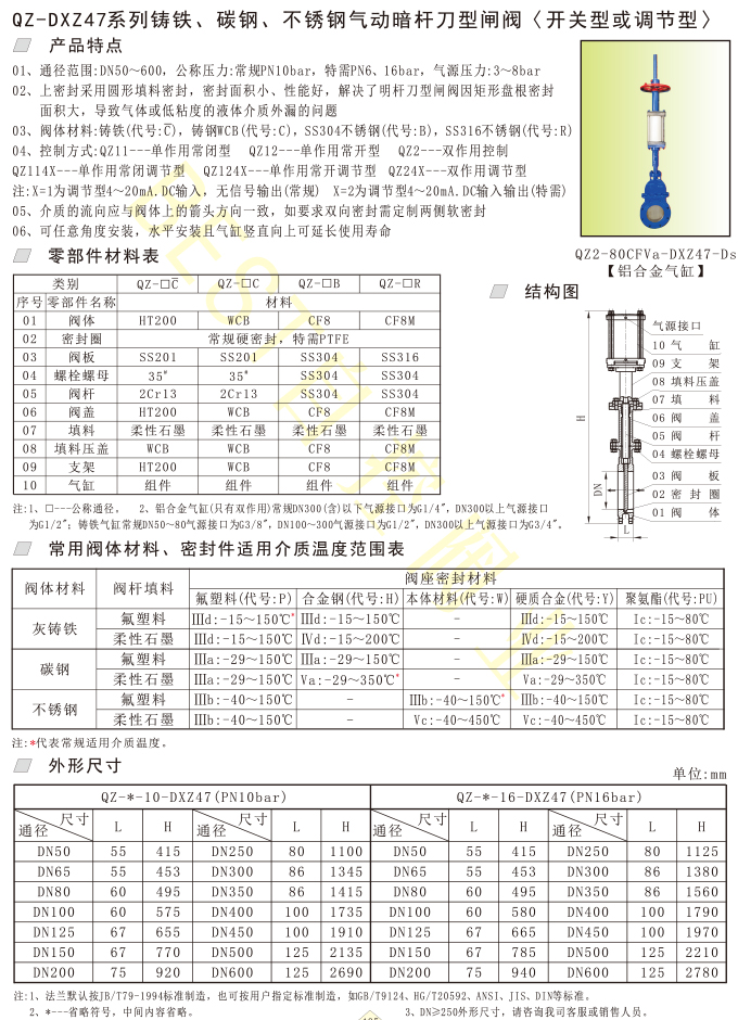 01、通径范围:DN50~600,公称压力:常规PN10bar,特需PN6、16bar,气源压力:3~8bar