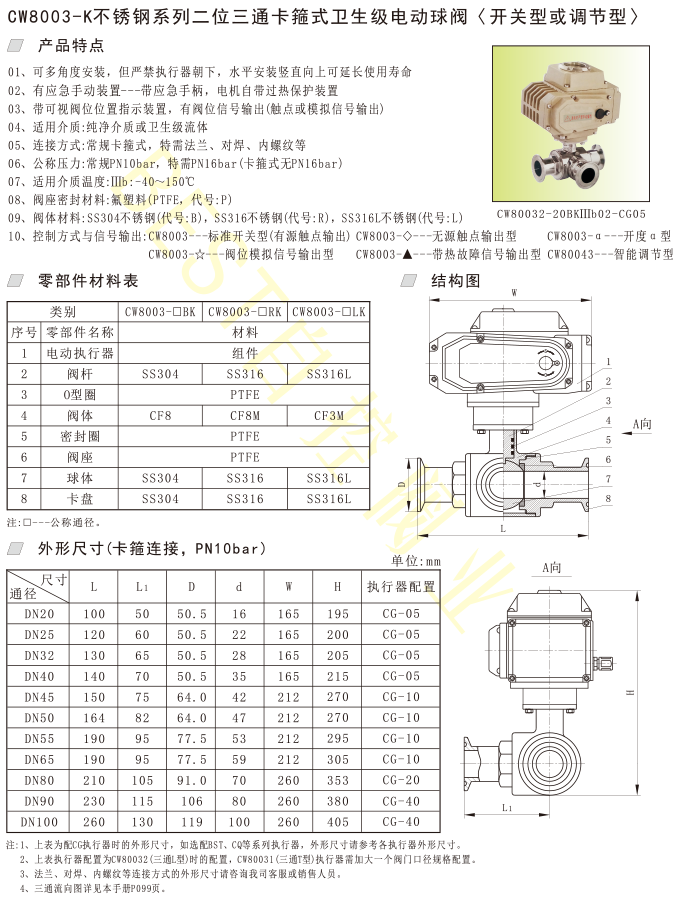 CW8003-K不锈钢系列二位三通卡箍式卫生级电动球阀〈开关型或调节型〉