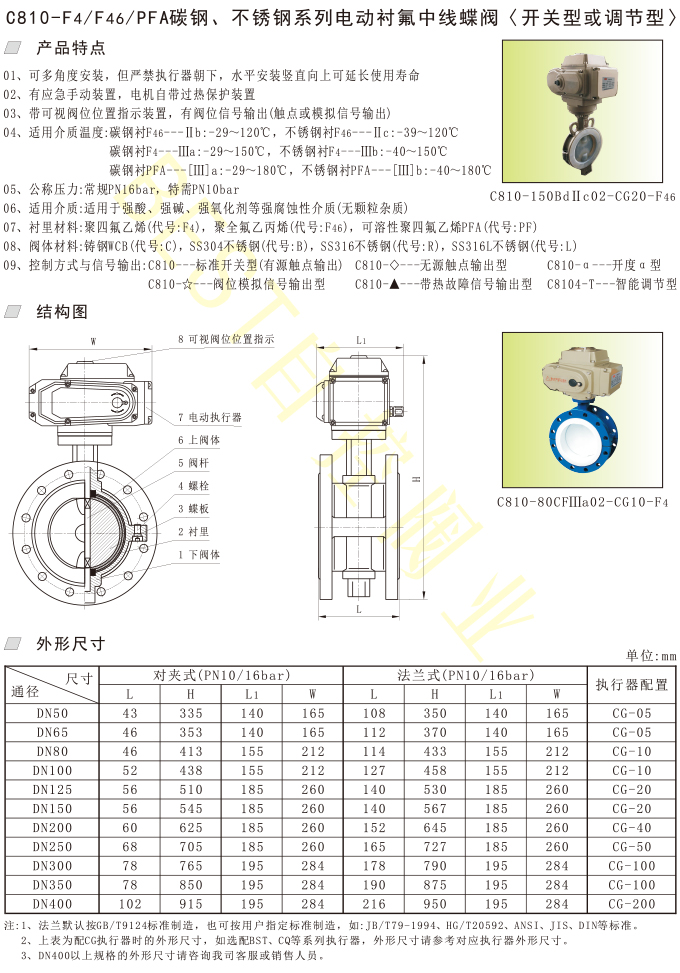 C810-F4/F46/PFA碳钢、不锈钢系列电动衬氟中线蝶阀〈开关型或调节型〉