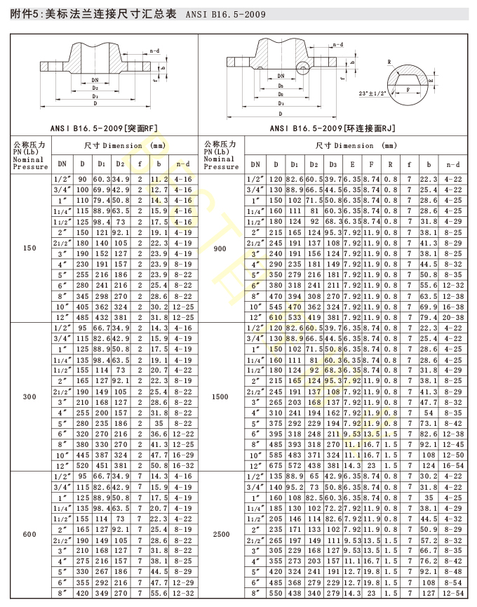 附件5:美标法兰连接尺寸汇总表 ANSI B16.5-2009