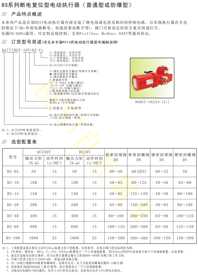 本系列产品是在原BEST电动执行器内部安装了锂电池或电容及相应的控制电路,以实现执行器在失电的情况下(如:外部电源断电、电线因事故断开等),阀门可按设定好的方案关闭或打开。
